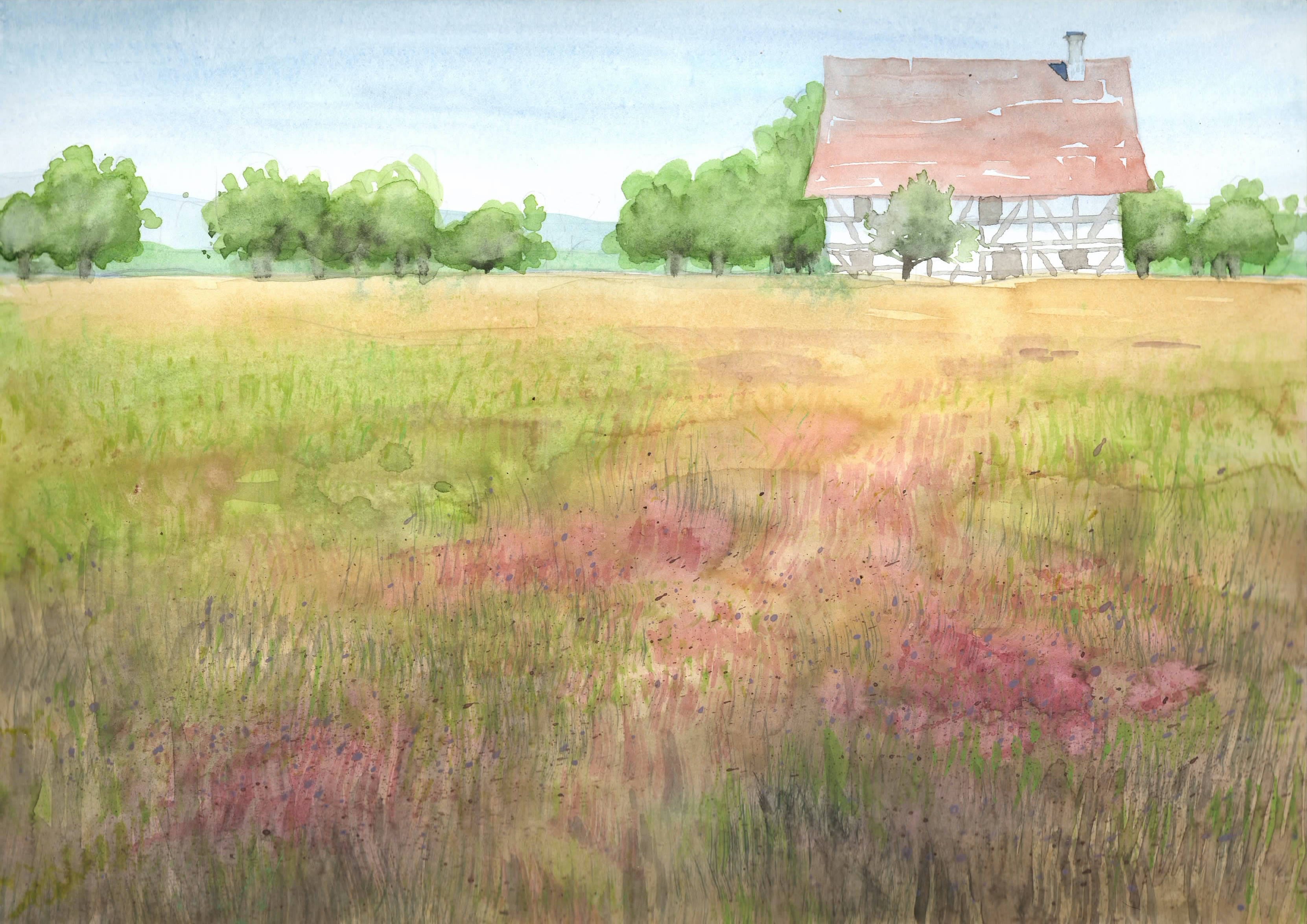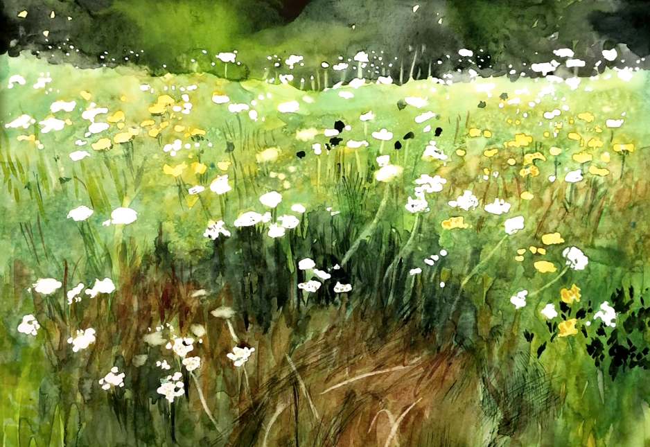 Meine erste Reaktion auf eine schöne Wiese ist nicht, zum Pinsel zu greifen. Eigentlich möchte ich meine Arme ausbreiten und die Wiese umarmen. Weil das aber nicht so gut möglich ist, greife ich dann doch zum Pinsel und versuche, das zarte Gefühl von Weichheit und Fülle, das Wiesen bei mir auslösen, aufs Papier zu bringen.